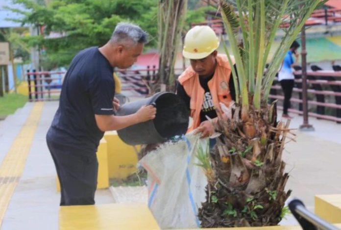 SAOKAREBA – Bupati Luwu Timur, Budiman memungut sampah yang berserakan di Anjungan Sungai Malili, Kecamatan Malili, Minggu (19/2/2023).