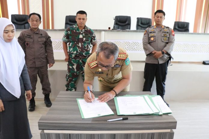 SAOKAREBA – Dinas Perdagangan Luwu Timur melakukan penandatanganan pakta integritas dengan pengelola SPBU dalam rapat koordinasi di Aula Sasana Praja Kantor Bupati Luwu Timur, Selasa (18/4/2023).