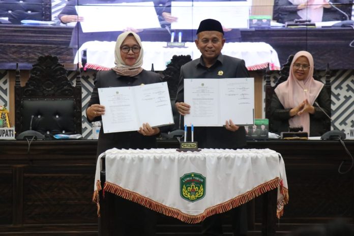 SAOKAREBA – Wakil Bupati Luwu Timur, Puspawati Husler, bersama Wakil Ketua I DPRD, HM Siddiq BM, menandatangani nota kesepakatan rancangan awal (Ranwal) Rencana Pembangunan Jangka Menengah Daerah (RPJMD) Luwu Timur Tahun 2025-2029 dalam rapat paripurna, Rabu (16/4/2025).