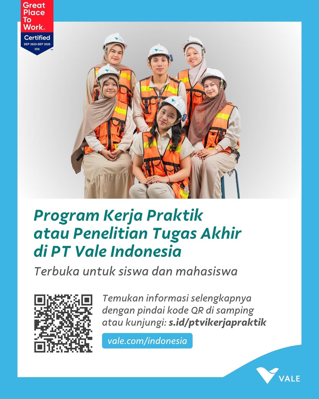 SAOKAREBA – PT Vale Indonesia Tbk membuka kesempatan untuk mahasiswa yang ingin melaksanakan kerja praktik (KP) dan penelitian tugas akhir di PT Vale Indonesia Tbk.
