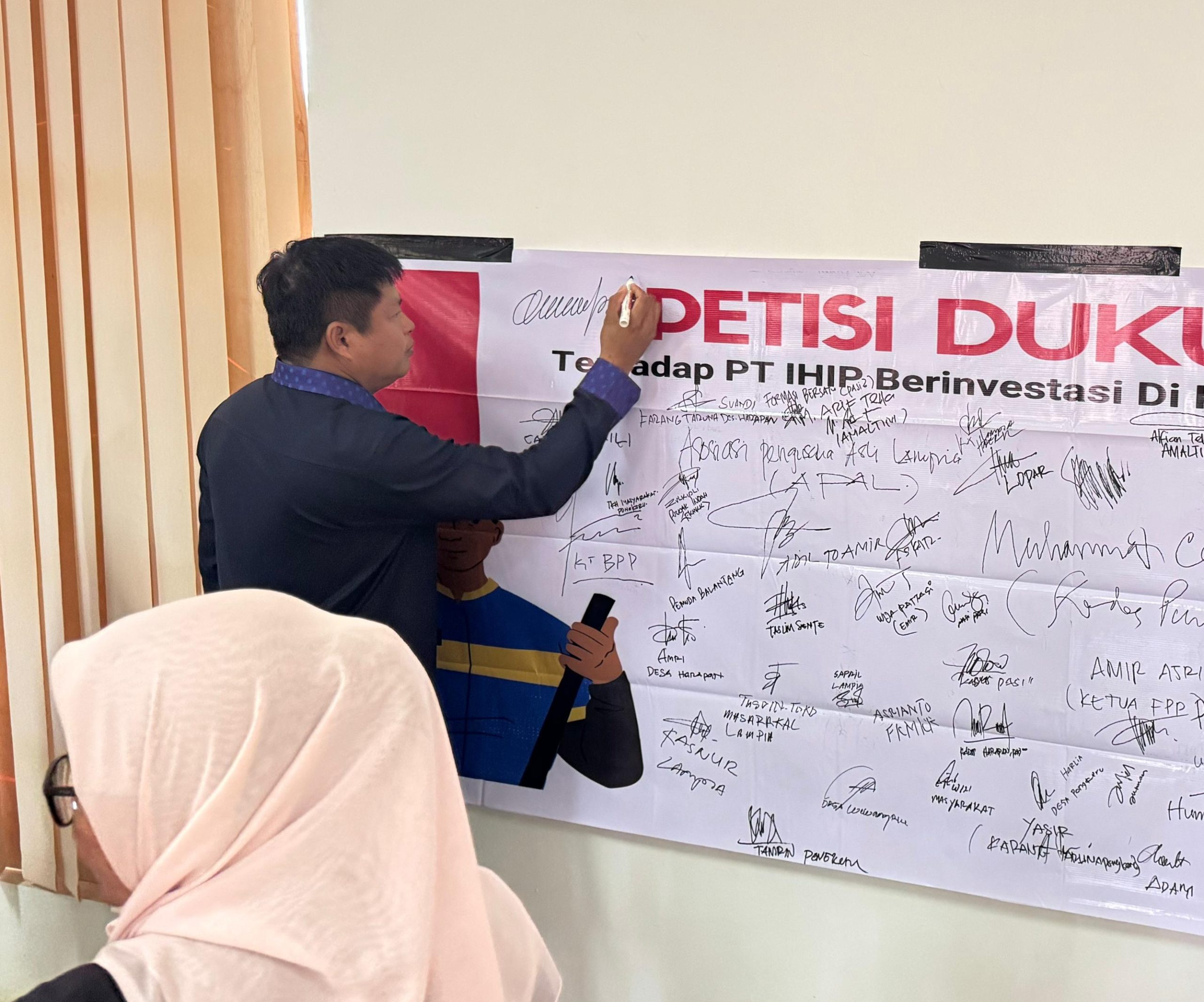 SAOKAREBA – Pimpinan DPRD Luwu Timur ikut menandatangani spanduk petisi dukungan terhadap PT IHIP untuk berinvestasi di Kabupaten Luwu Timur, Rabu (29/10/2025).