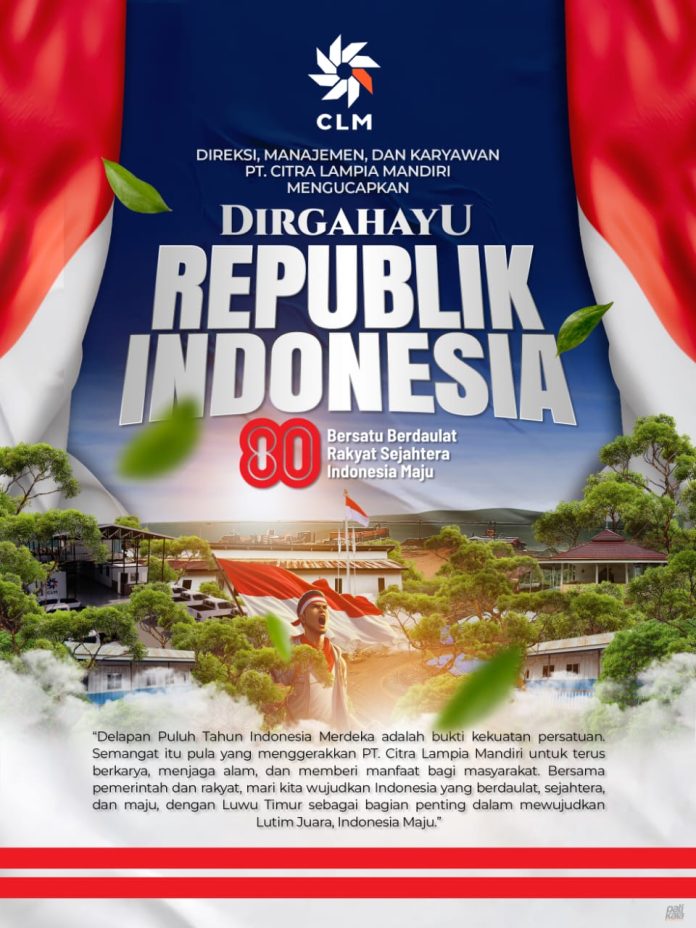 BerandaNewsPT CLM: Dirgahayu Republik Indonesia ke-80 News PT CLM: Dirgahayu Republik Indonesia ke-80 By Redaksi Saokareba 16 Agustus 2025 0 Bagikan FacebookTwitterPinterestWhatsApp TagsHUT RI ke-80PT CLM Bagikan FacebookTwitterPinterestWhatsApp Artikel SebelumnyaPBB Naik Jadi Polemik di Sejumlah Daerah, Luwu Timur Stabil, Bupati Irwan: Kami Tidak Ingin Tambah Beban MasyarakatArtikel BerikutnyaTarif PBB-P2 Tidak Dinaikan, Pemkab Luwu Timur Pilih ‘Manjakan’ Warga dengan Program Pro Rakyat Redaksi Saokarebahttp://saokareba.id RELATED ARTICLES News Bunda PAUD Ani Nurbani Sosialisasi Advokasi Wajib Belajar 13 Tahun di Luwu Timur 10 Oktober 2025 News Bunda PAUD Ani Nurbani Anjurkan Ibadah Sebelum Masuk Kelas di Luwu Timur 10 Oktober 2025 News Soal Kebersihan, Desa Terburuk di Luwu Timur Bakal Dapat Sapu Hitam dan Bendera Hitam 30 September 2025 TINGGALKAN KOMENTAR Batal membalas Komentar: Silakan masukkan komentar anda! Nama:* Silakan masukkan nama Anda di sini Email:* Anda telah memasukkan alamat email yang salah! Silakan masukkan alamat email Anda di sini Website: Simpan nama, email, dan situs web saya di browser ini untuk lain kali saya berkomentar. - Advertisment - Most Popular Jebolan SSB Gasmar Tembus Skuaq PSM U-20, Bupati, Ketua KONI Hingga Ketua PSSI Luwu Timur: Ini Kebanggaan! 10 Oktober 2025 Bunda PAUD Ani Nurbani Sosialisasi Advokasi Wajib Belajar 13 Tahun di Luwu Timur 10 Oktober 2025 Bunda PAUD Ani Nurbani Anjurkan Ibadah Sebelum Masuk Kelas di Luwu Timur 10 Oktober 2025 Nadya Chumaera Azzahra Kembali Sabet Emas, Kali Ini di Kejuaraan Renang Athirah Cup III 9 Oktober 2025 Muat lebih banyak