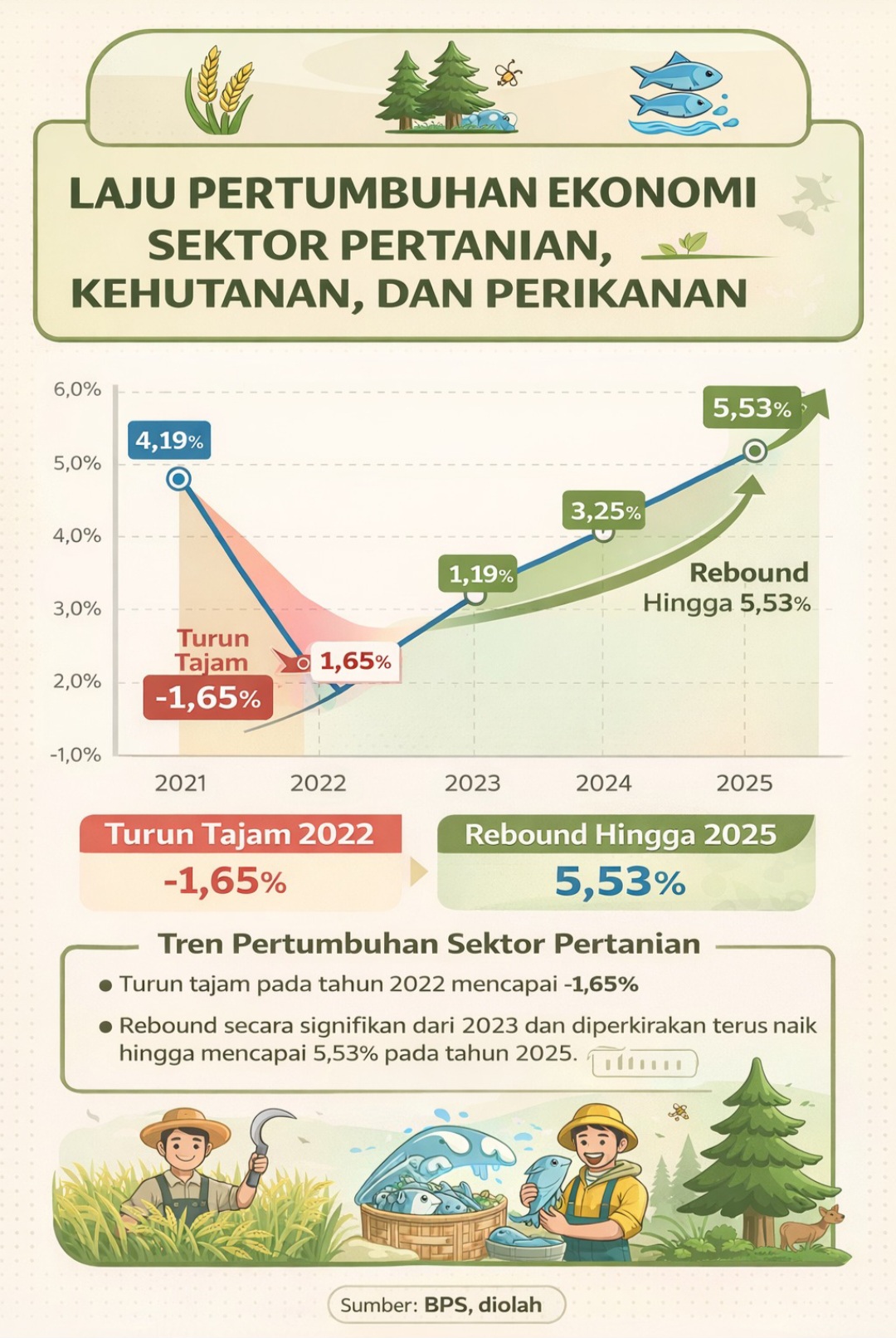 Data BPS yang diolah, sektor pertanian secara nasional memang sempat mengalami kontraksi atau penurunan tajam sebesar -1,65 persen pada tahun 2022.